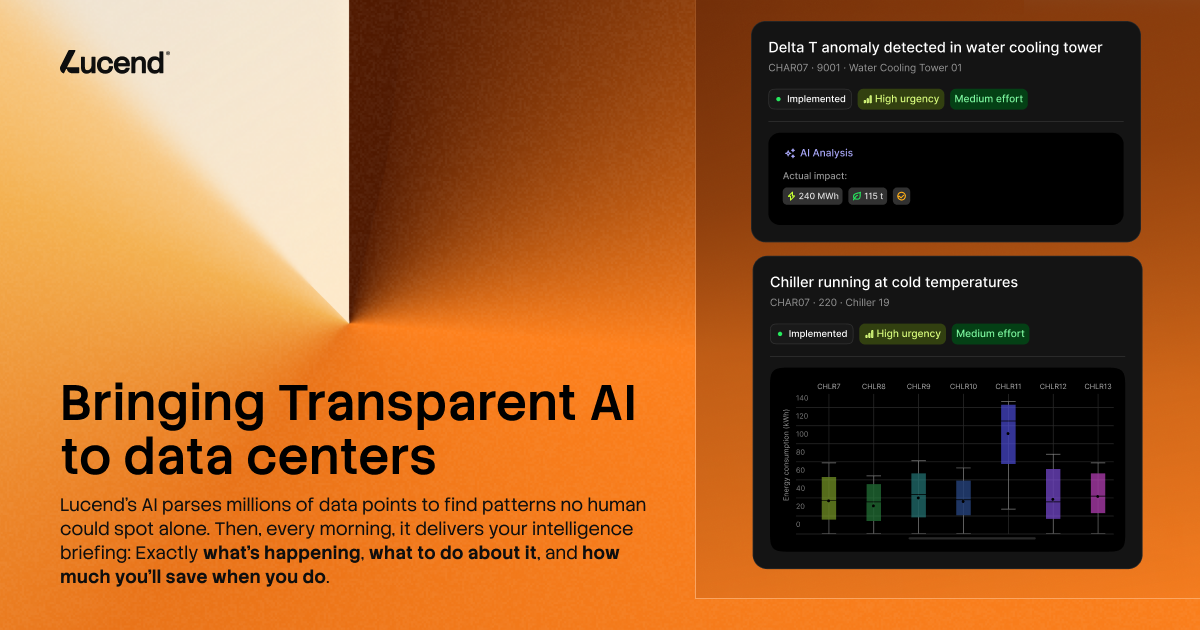 Lucend has built a unified, Transparent AI platform that connects directly to a datacenter’s existing infrastructure—without requiring new hardware. By leveraging the data points already embedded across facilities, Lucend turns static systems into adaptive, self-learning environments that provide operators with acomprehensive, real-time view of the entire data center ecosystem. The result is more efficient--cost-efficient and energy-efficient data centers.
